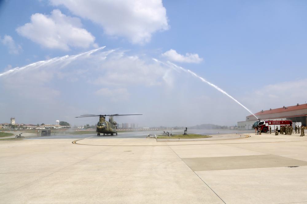 Chief Warrant Officer 5 Brett W. Haskin flew his final mission flight on May 6, 2022 while serving as the Brigade Aviation Maintenance Officer for 2nd Combat Aviation Brigade, 2nd Infantry Division/ROK-U.S. Combined Division and was greeted with a water canon salute from the Camp Humphreys Fire Department upon his taxi on the tarmac.