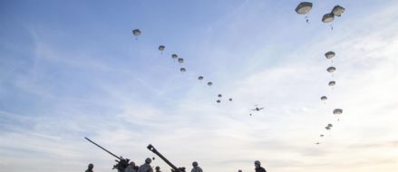 Paratroopers descend over Malemute drop zone while team members prepare 105 mm howitzers during airborne and live-fire training at Joint Base Elmendorf-Richardson, Alaska, Nov. 22, 2016. Air Force photo by Alejandro Pena Learn more about arctic warfare training in the video below: