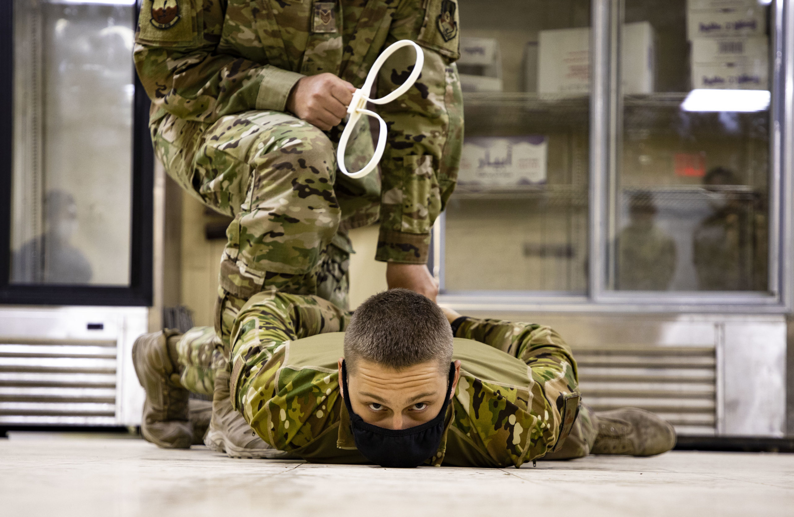 U.S. Airmen, demonstrate the detaining of an individual using handcuffs during the Security Forces Augmentation Course at Ali Al Salem Air Base, Kuwait, Sep. 4th, 2020.