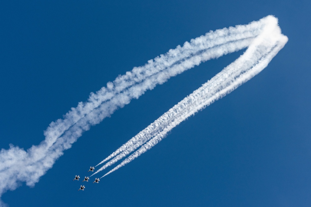The U.S. Air Force Thunderbirds perform a demonstration during the Mather Airshow at Mather Airport, Sacramento, California, Sept. 23, 2018. The U.S. Air Force Demonstration Squadron or “Thunderbirds” were created in 1953. U.S. Air Force photo by Senior Airman Lauren Parsons/Released