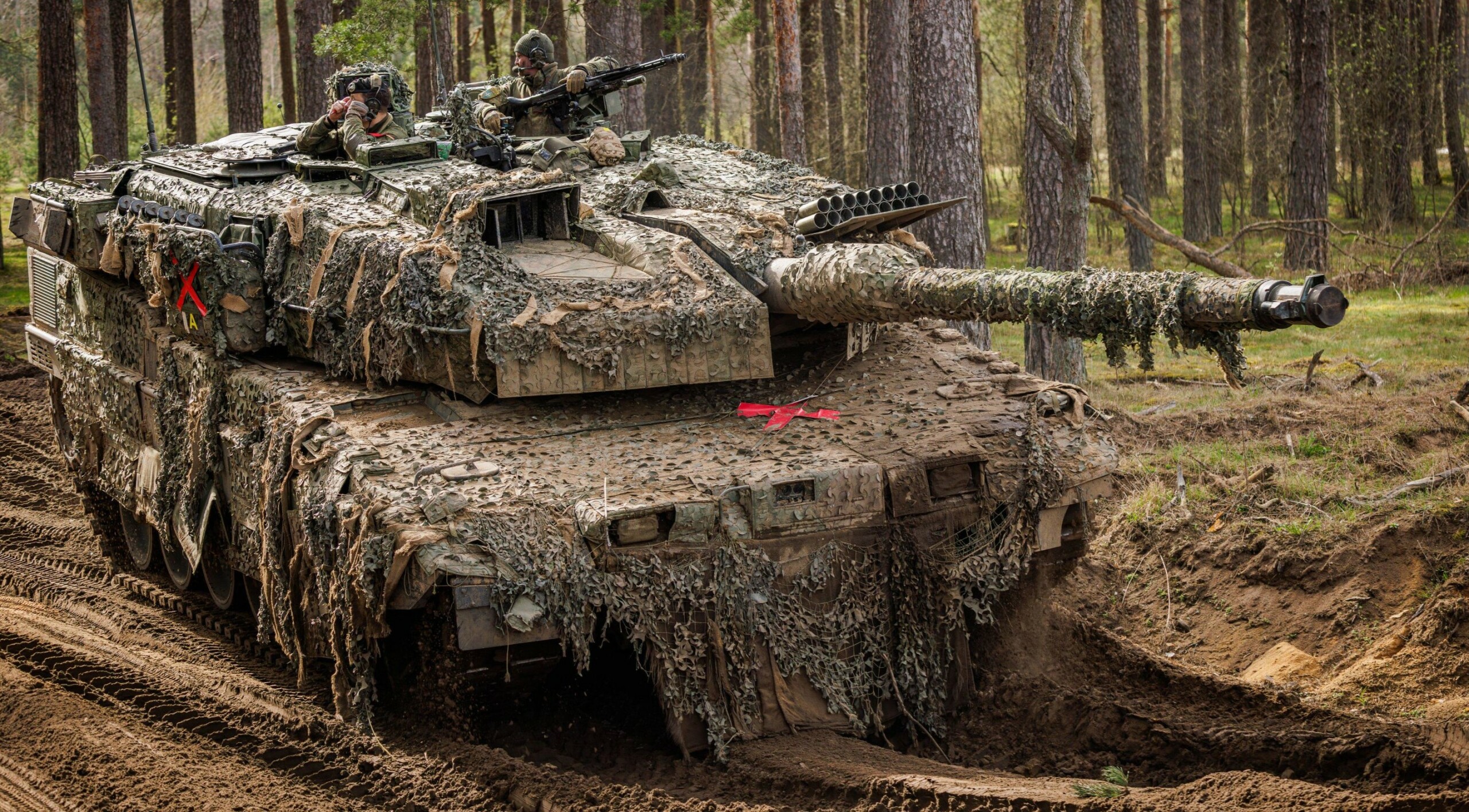 A Leopard 2 main battle tank makes its way through mud in Lithuania.