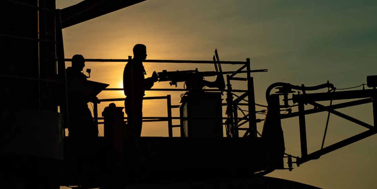 Navy Seaman Elijah Bushy and Petty Officer 2nd Class Johnathan Divietro stand vigilant aboard the USS Theodore Roosevelt, a symbol of power and peace in the Indo-Pacific, as it departs Thailand’s Laem Chabang.