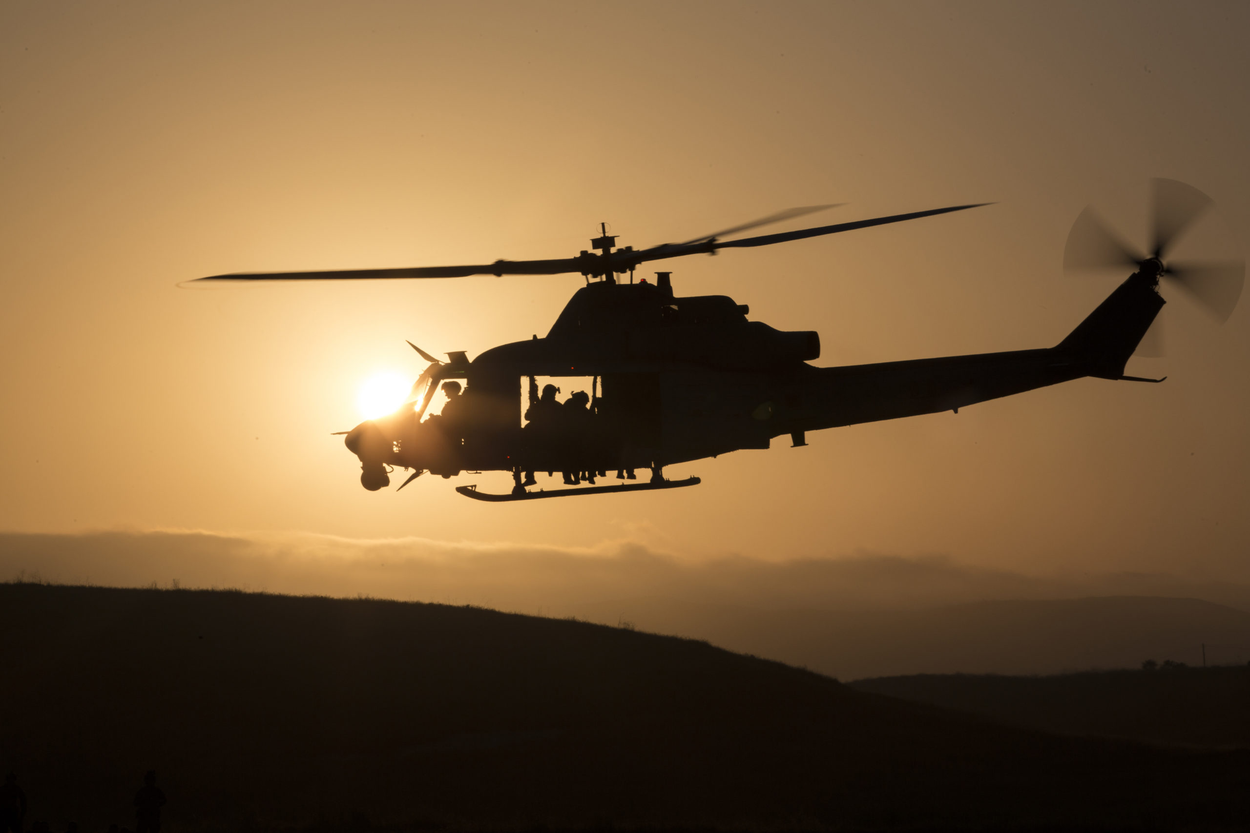 Marine Corps Cpl. Tyrell Bluto and military working dog Nero prepare to fast-rope out of a UH-1Y Venom helicopter.