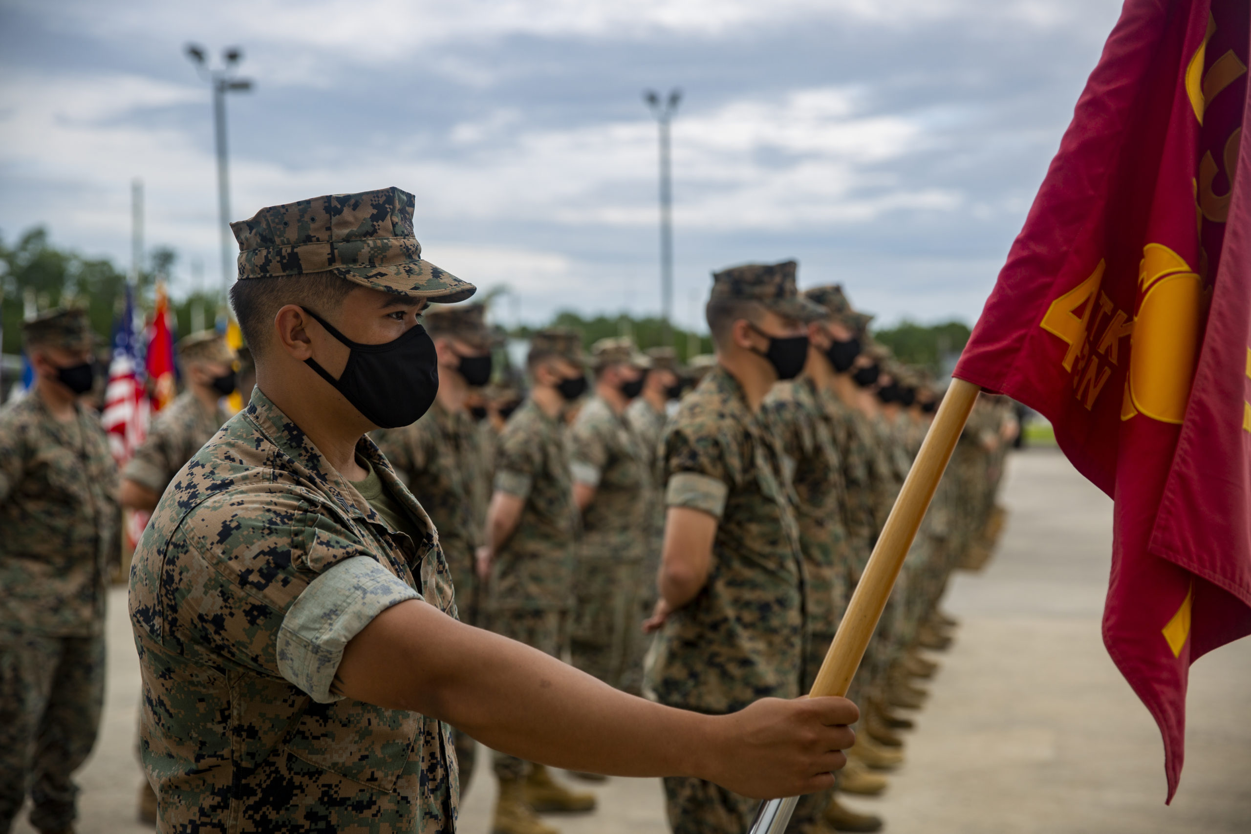 U.S. Marine Corps Sgt. Matthew Octaviano holds the company guidon during a deactivation ceremony on Marine Corps Base Camp Lejeune at Stone Bay, North Carolina, Aug. 25, 2020.