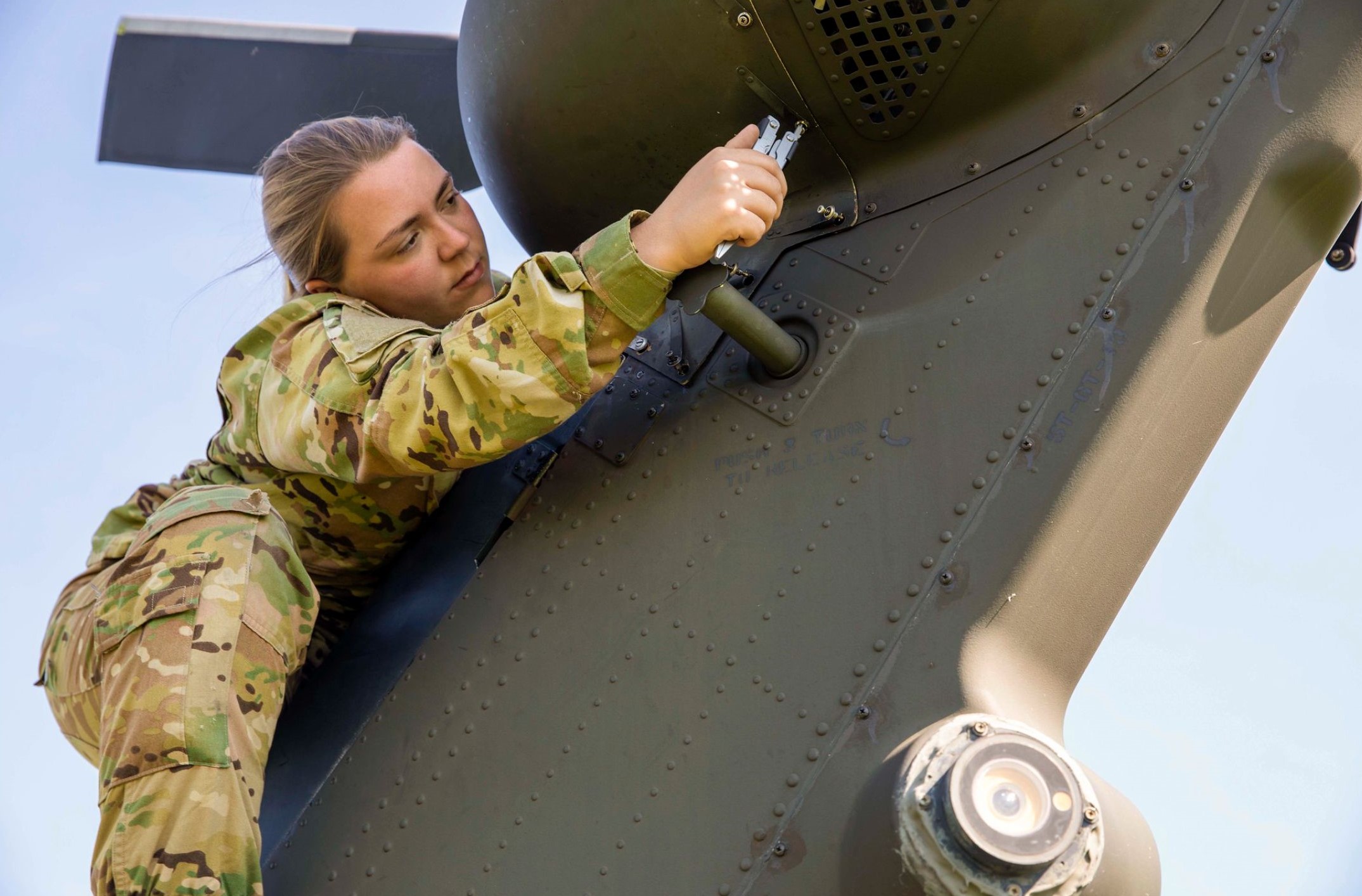 An Army Specialist makes sure everything is tight on a UH-60M Black Hawk