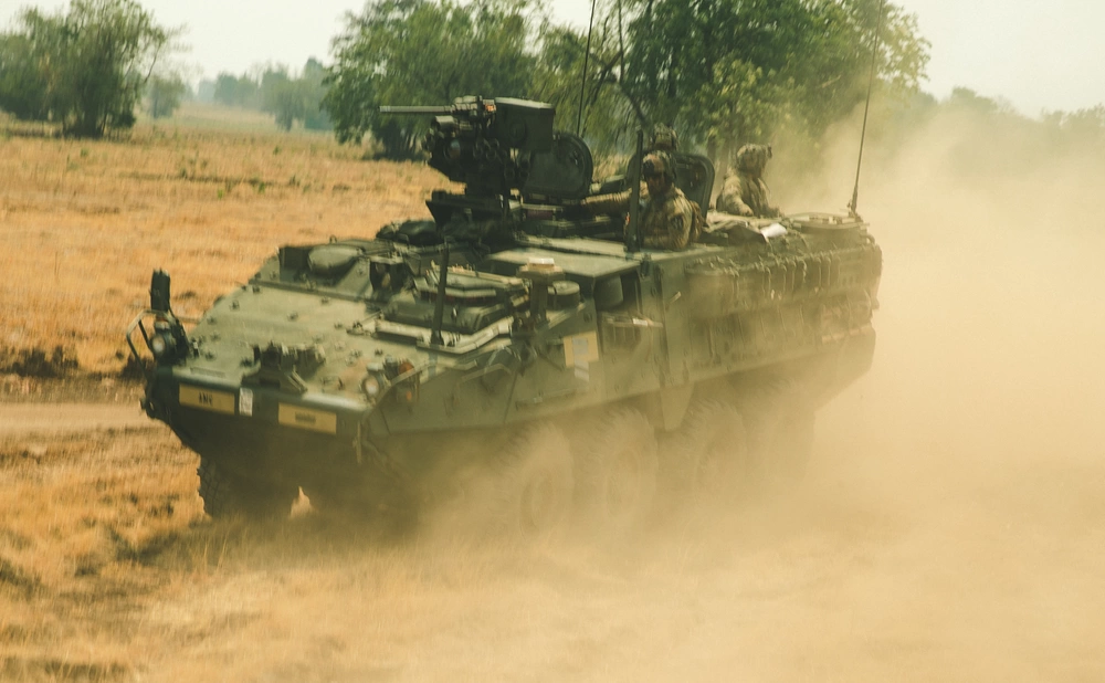 U.S. Army Stryker armored vehicles from 2nd Battalion, 3rd Infantry Regiment, travel in formation to their objective during a combined arms live fire exercise rehearsal as part of exercise Cobra Gold.