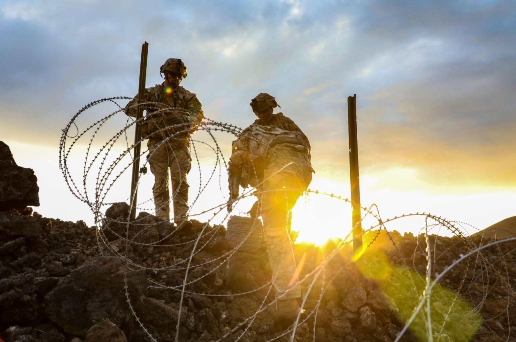 Soldiers set up concertina wire as an obstacle in Hawaii.