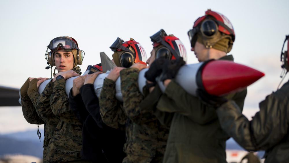 U.S. Marines with Marine Fighter Attack Squadron 242 prepare to mount an AIM-120 Advanced Medium-Range Air-to-Air missile onto an F-35B Lightning II aircraft at Marine Corps Air Station Iwakuni, Japan