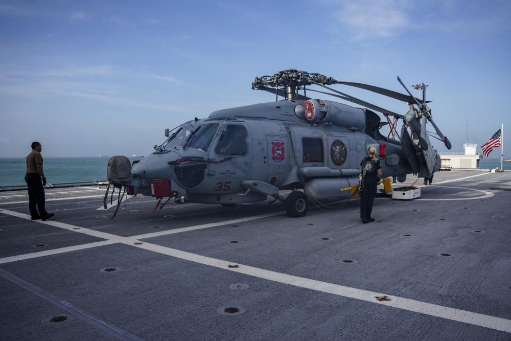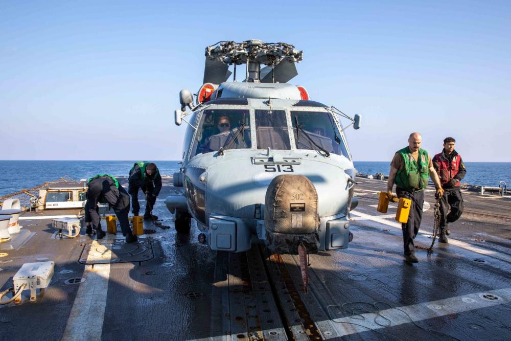 Sailors assigned to the Arleigh Burke-class guided-missile destroyer USS Nitze (DDG 94) remove chock and chains from an MH-60R Seahawk helicopter, attached to Helicopter Maritime Strike Squadron (HSM) 48.